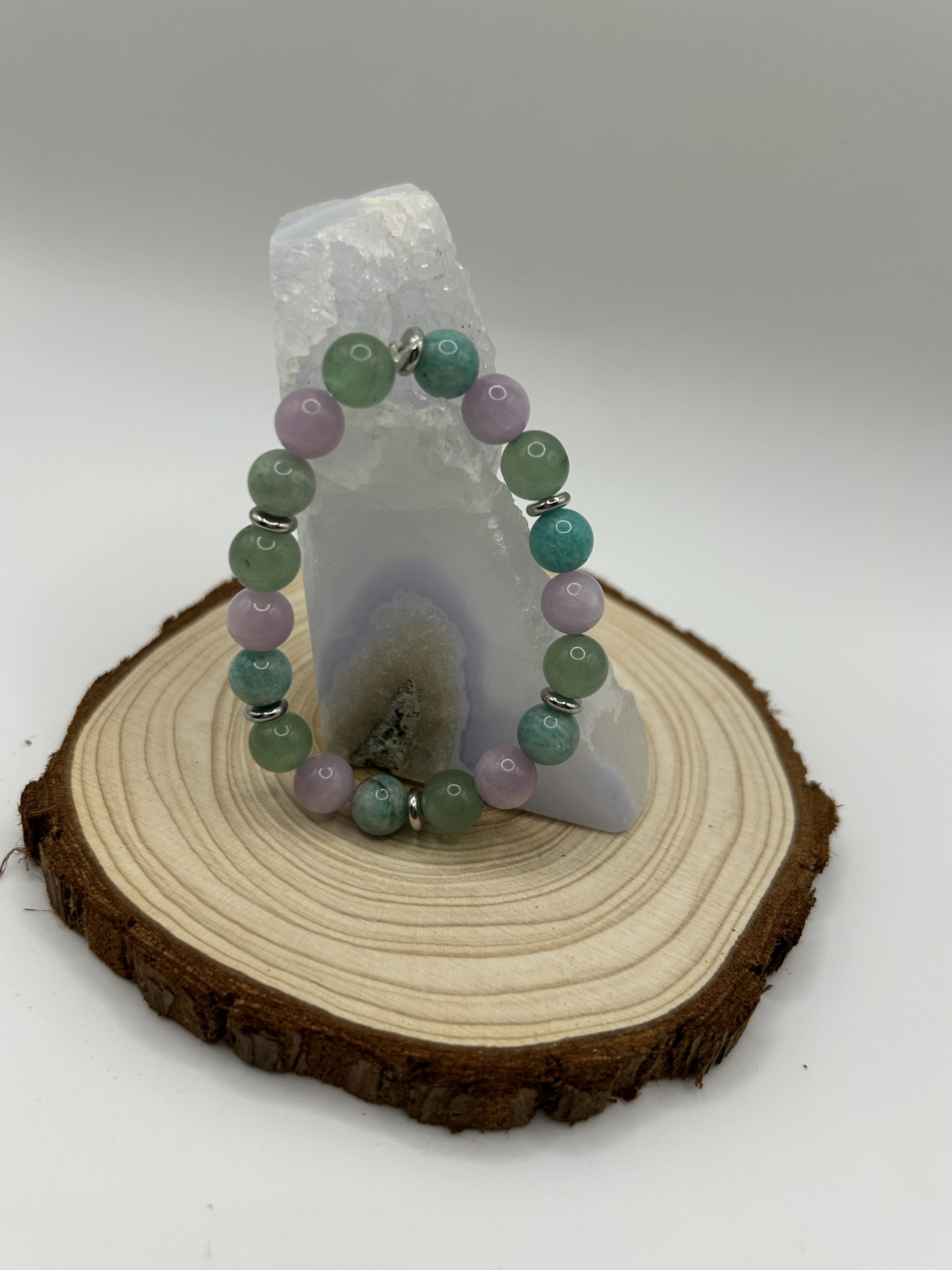 Le bracelet Apaisement, Équilibre & Harmonie accompagne les moments de stress, de tension ou de surcharge émotionnelle. L’alliance de l’amazonite, de la kunzite et de l’aventurine verte crée une énergie douce et enveloppante, idéale pour calmer l’esprit, soutenir le cœur et retrouver sérénité et équilibre.