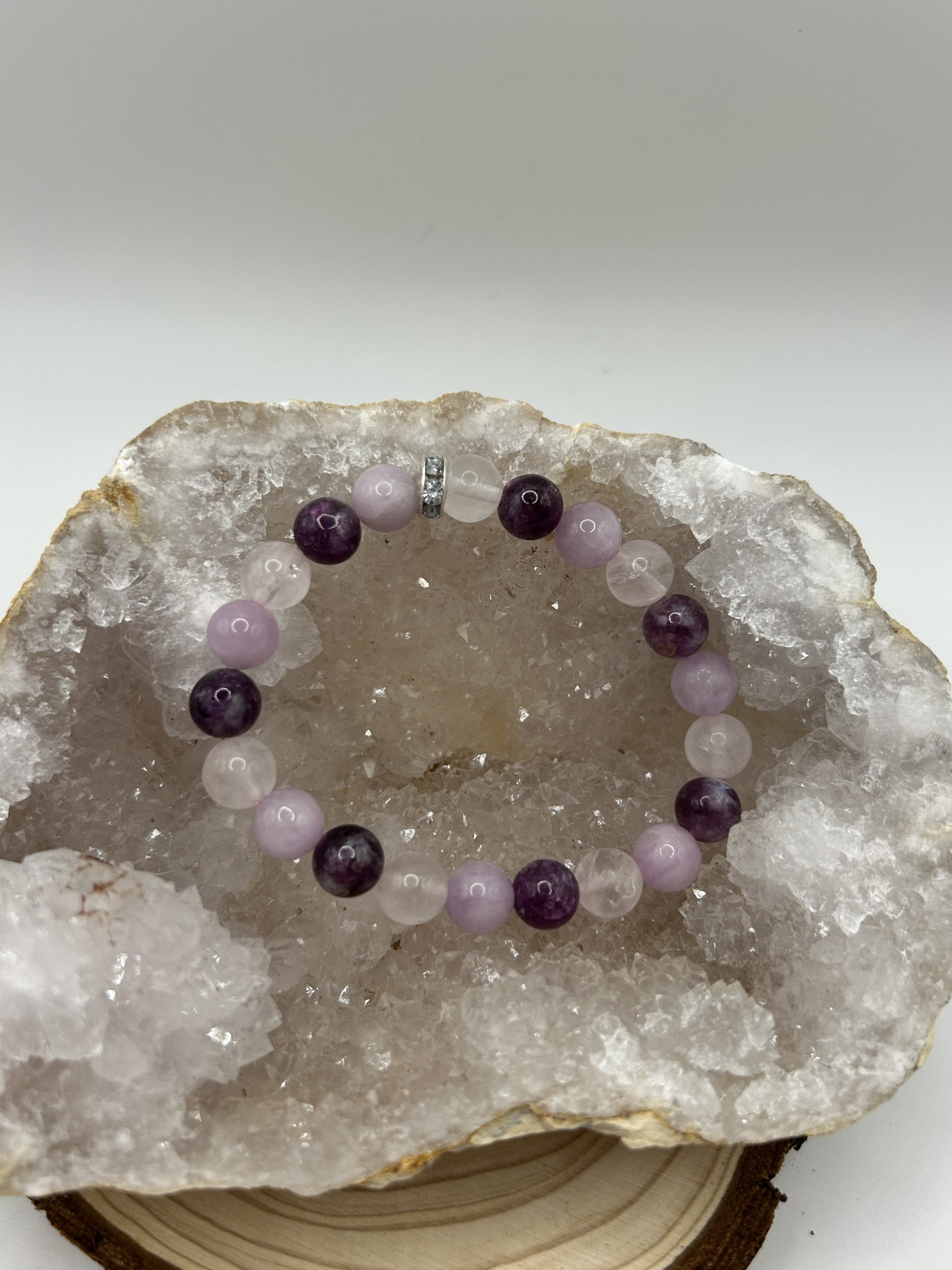 Bracelet artisanal en Kunzite, Lépidolite et Quartz Rose, conçu pour libérer les blocages affectifs, apaiser les émotions et accompagner la guérison du cœur.