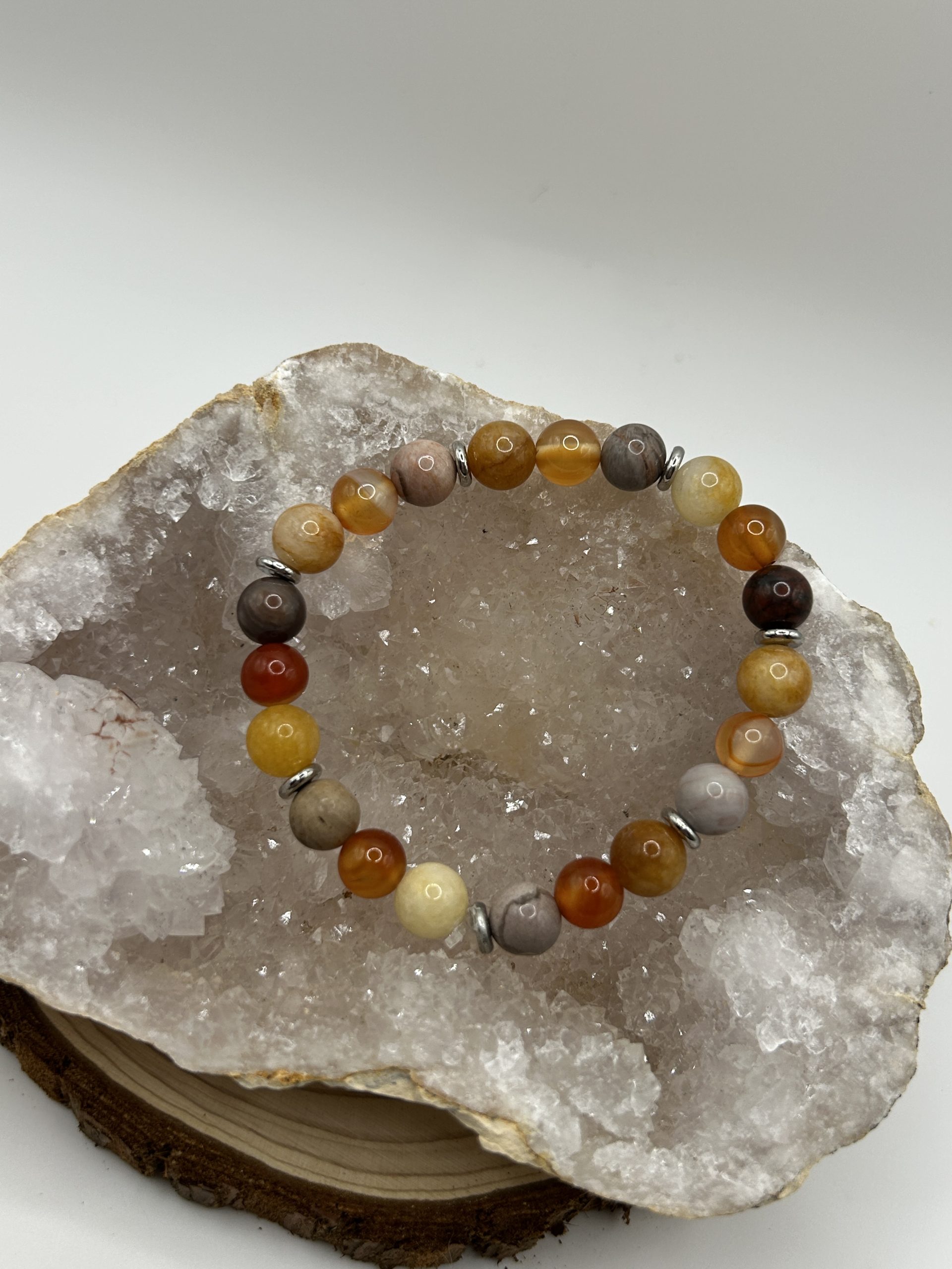Bracelet artisanal en Aventurine Jaune, Cornaline et Bois Fossilisé, conçu pour stimuler la créativité, renforcer la motivation et accompagner la reconstruction intérieure.