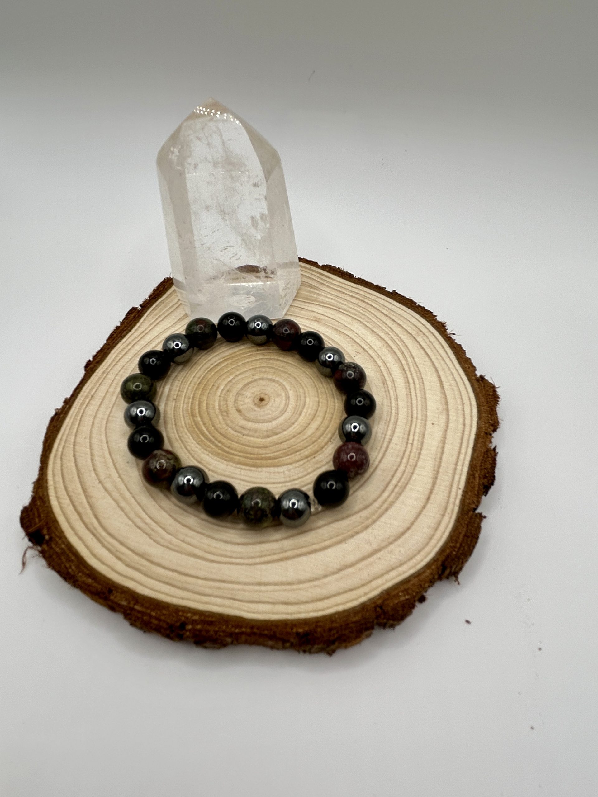 Bracelet artisanal en Jaspe Sang de Dragon, Hématite et Onyx Noir, conçu pour protéger l’énergie, renforcer l’ancrage et soutenir la force intérieure.