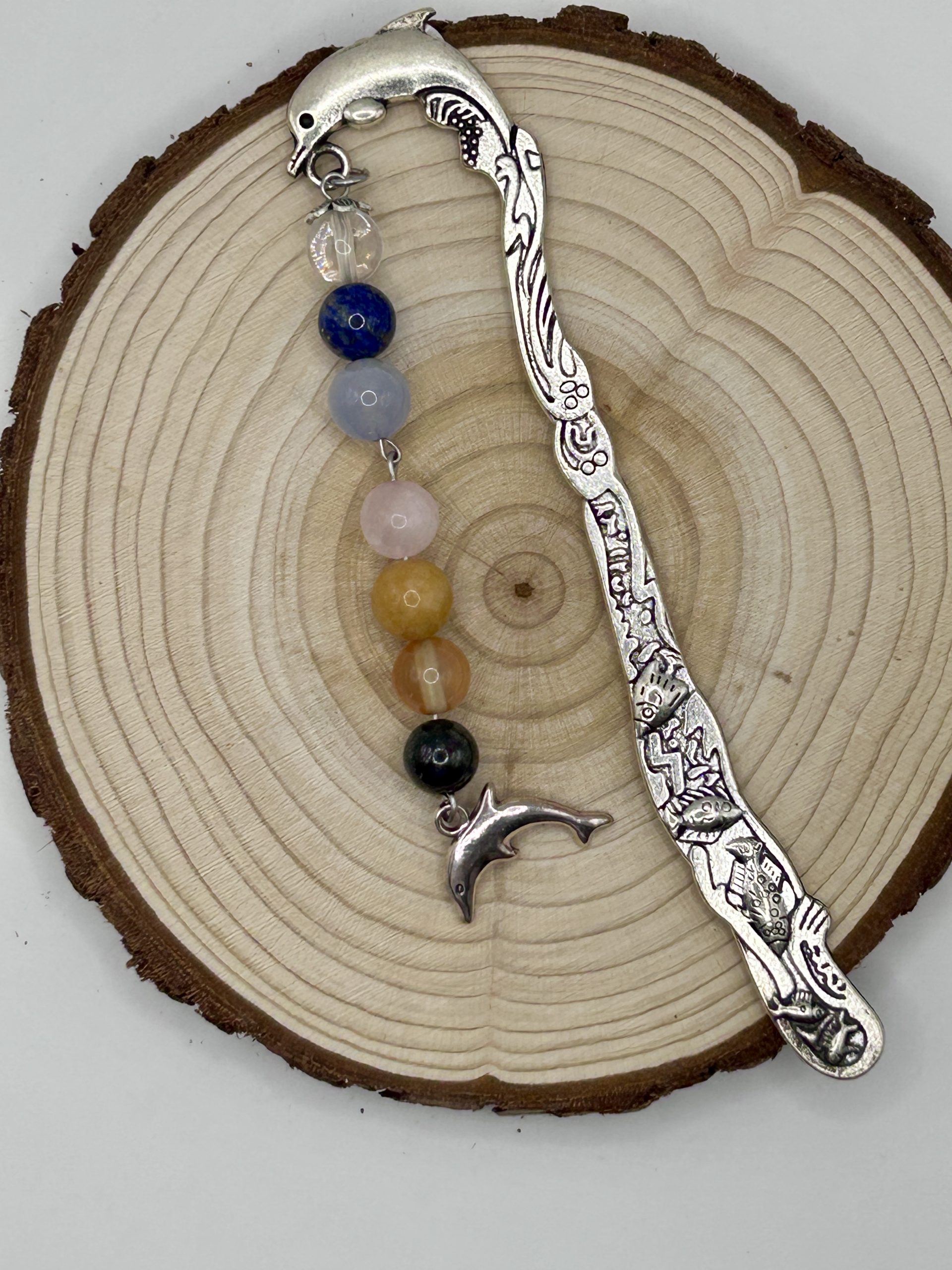 Marque-page sirène en pierres naturelles avec symbole dauphin, une création joyeuse et inspirante des 7 chakras.