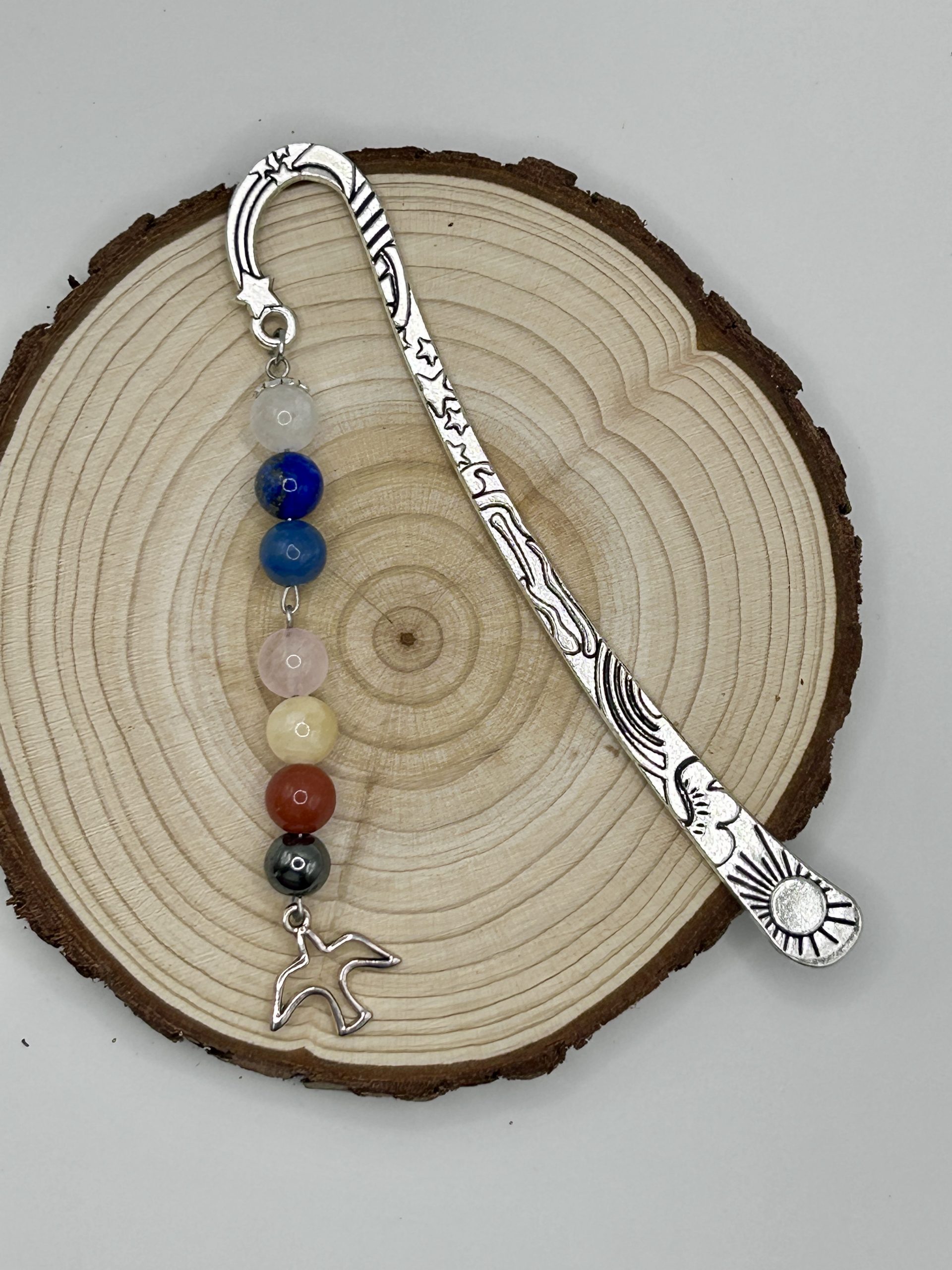 Marque-page en pierres naturelles avec symbole colombe, une création apaisante et harmonieuse inspirée des 7 chakras.