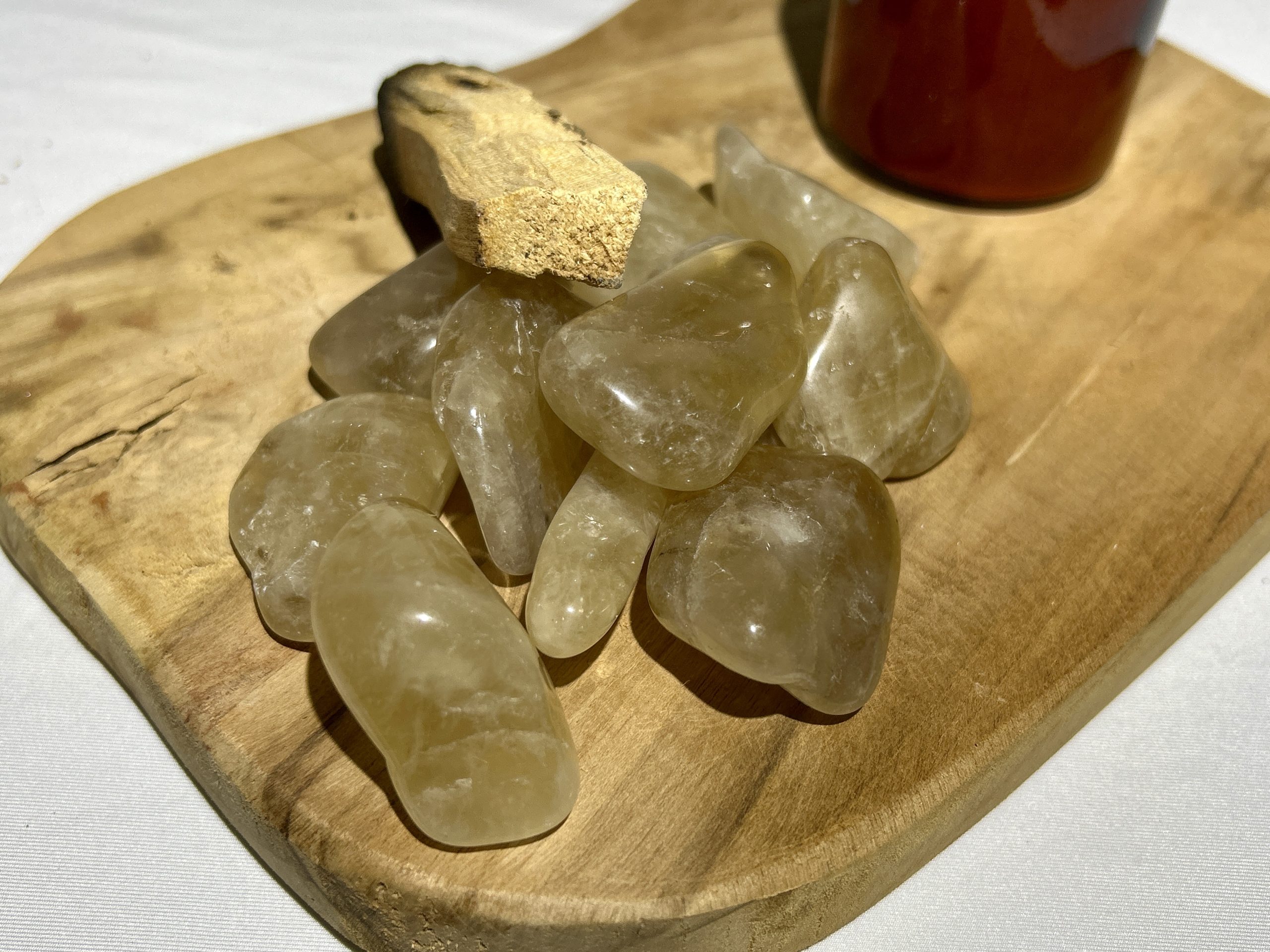 Citrine naturelle : Couleur jaune clair, doré, parfois miel de manière assez homogène et douce. Elle est transparente à semi-transparente, aspect pur, sans inclusions visibles. On l’a trouve le plus souvent au Brésil et à Madagascar.