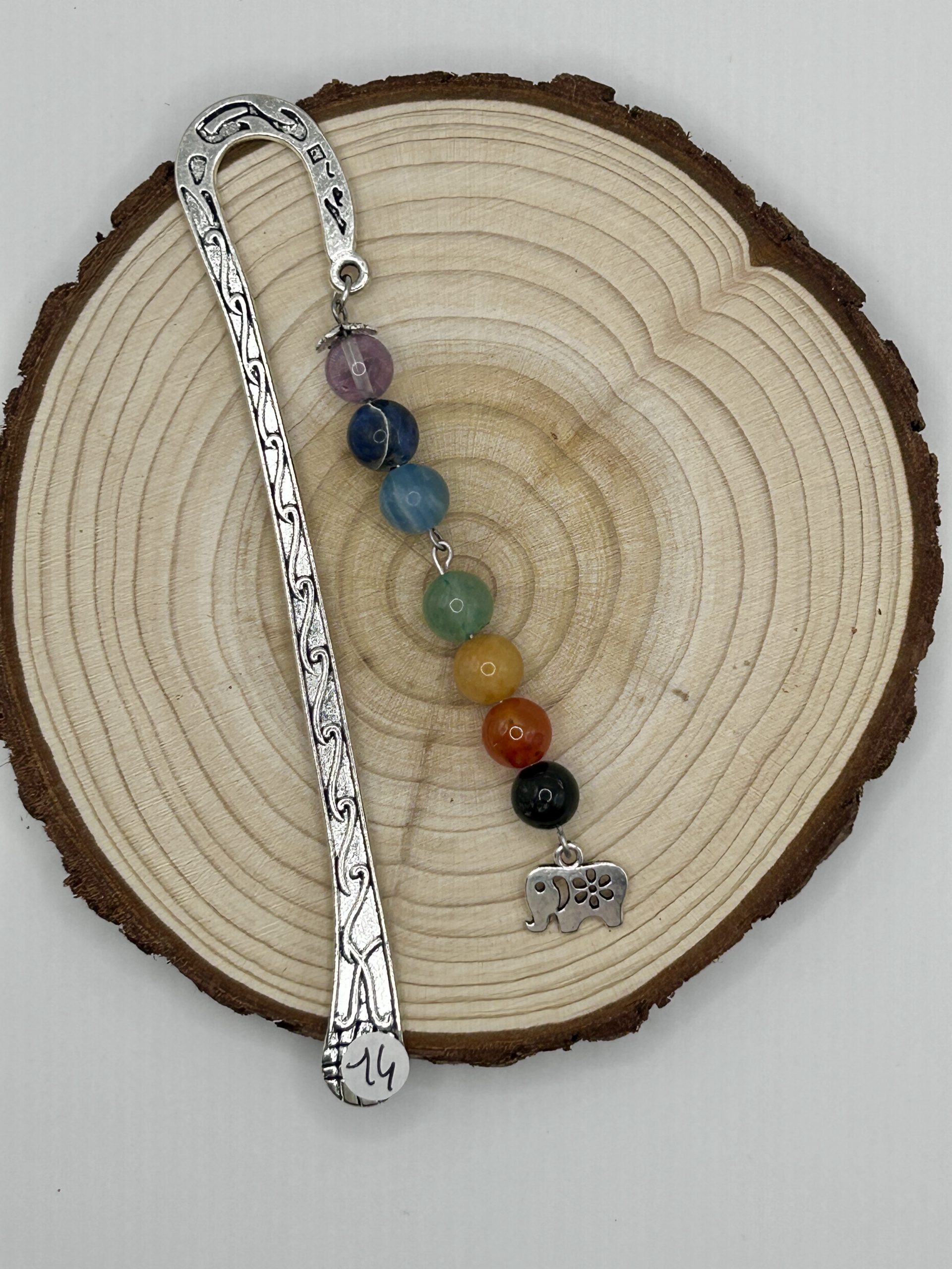 Inspiré par le mouvement et la sérénité, ce marque-page en pierres naturelles est accompagné d’un pendentif éléphant.