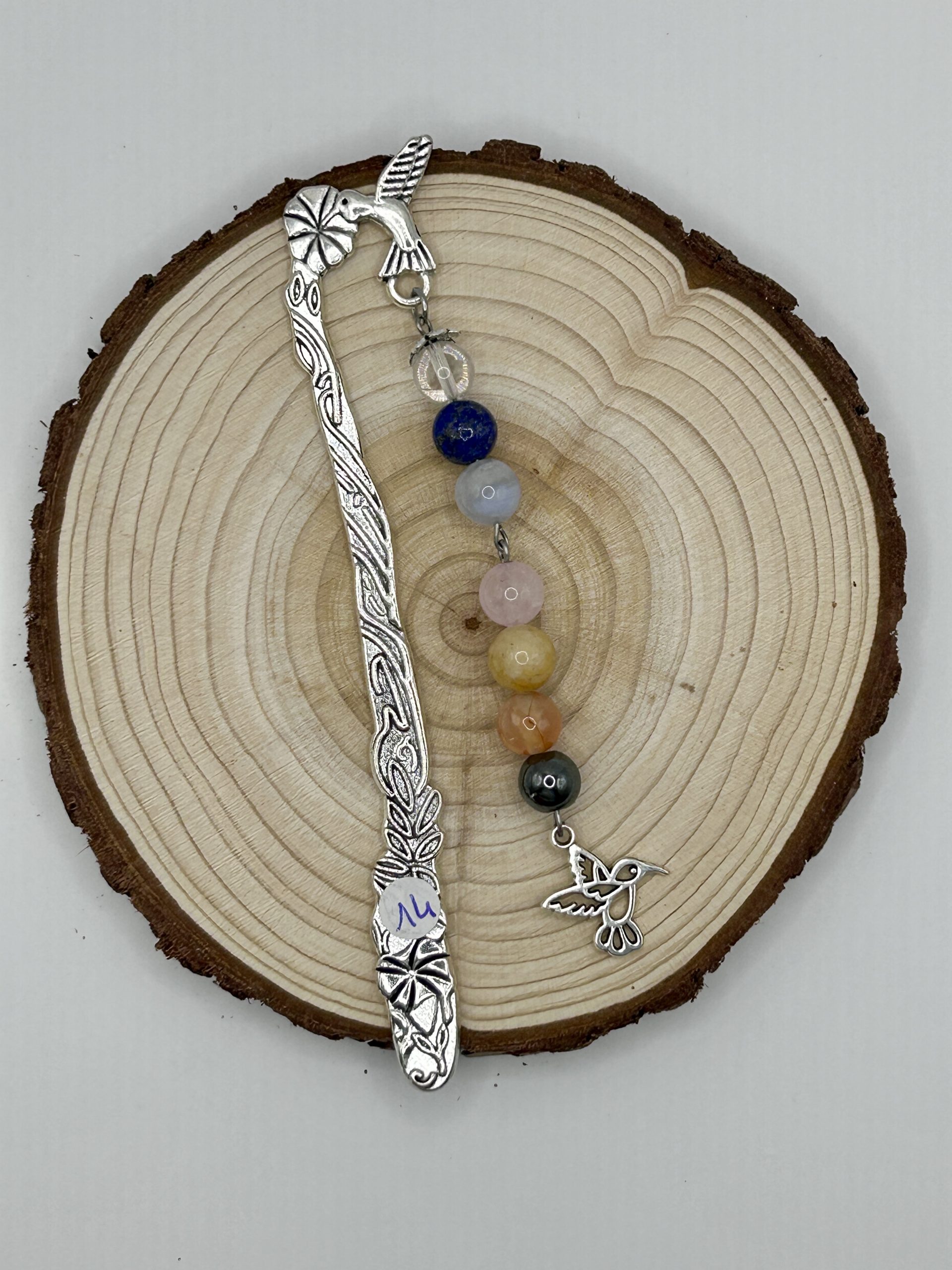 Délicat et lumineux, ce marque-page colibri en pierres naturelles, orné d’une touche florale et d’un symbole colibri, évoque la légèreté et la joie.